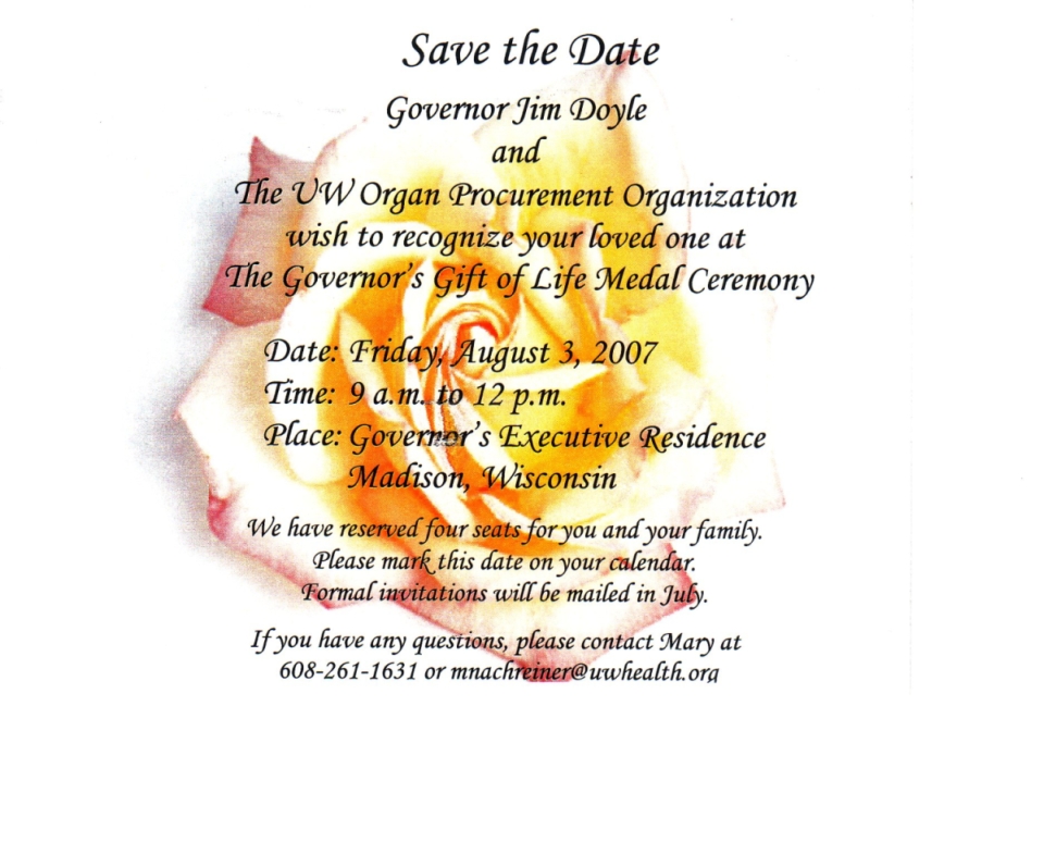 An invitation to attend The Governor's Gift of Life Medal Ceremony in Madison on August 3rd, 2007.